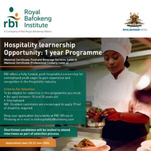 The Royal Bafokeng Institute (RBI) encourages all eligible candidates to seize this opportunity by submitting their applications promptly and ensuring they meet all specified requirements. RBI eagerly anticipates welcoming motivated individuals who are keen to begin a promising journey in the hospitality industry through our learnership program.